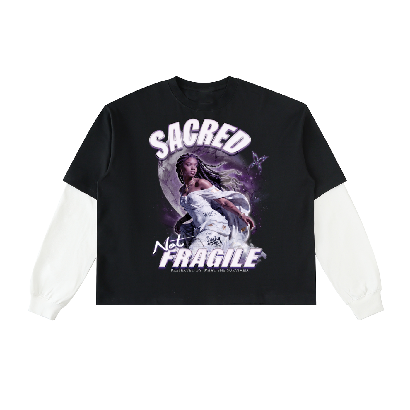 The Sacred, Not Fragile Tee is a statement piece rooted in resilience, femininity, and survival. Featuring a celestial-inspired graphic layered with rich purples and ethereal detail, this design honors strength that doesn’t need to be loud to be undeniable. Finished with the phrase “Preserved by what she survived,” this tee speaks for itself—quiet power, worn boldly.